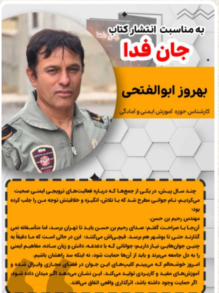 به گزارش ثلاث: نظر اساتید، کارشناسان و مربیان آتشنشانی درباره سالها فعالیت تخصصی و اثرگذار در مسیر آموزش و ترویج فرهنگ ایمنی همزمان با رونمایی از کتاب جانفدا اگر میخواهید بدانید اهل فن چه میگویند؟